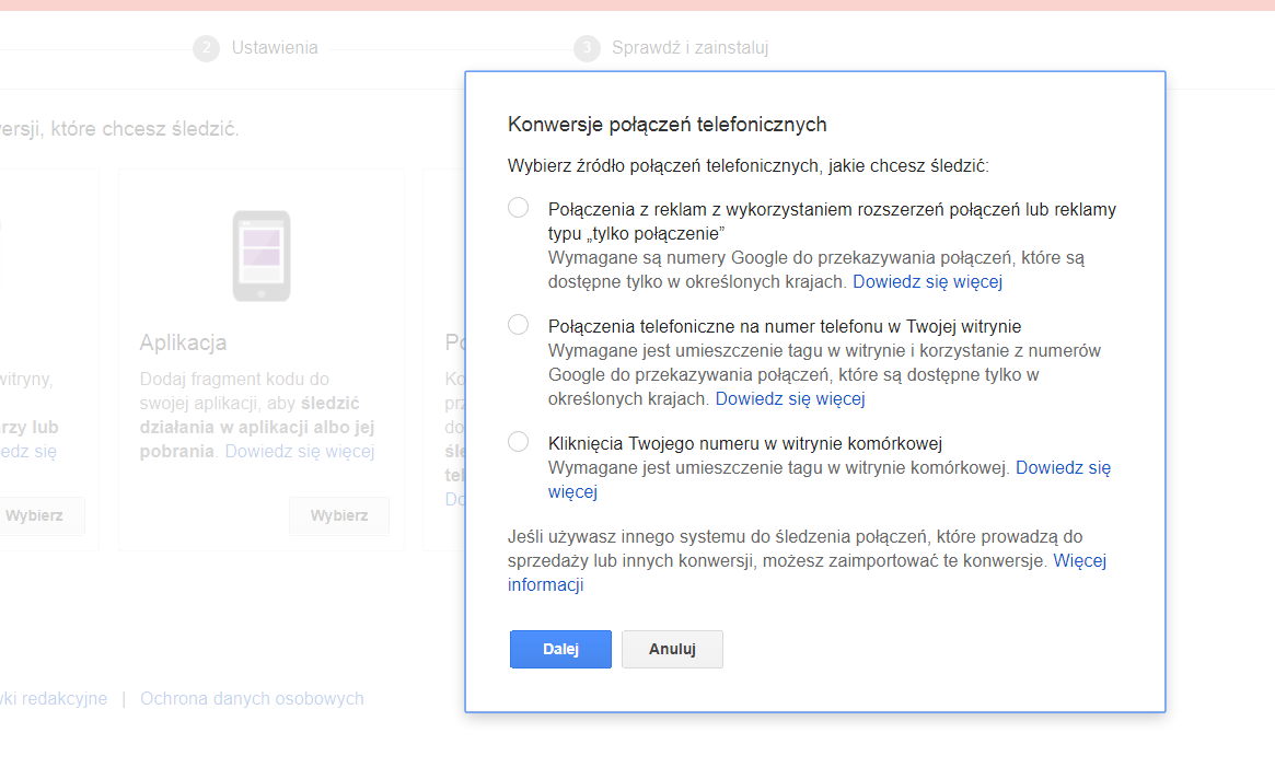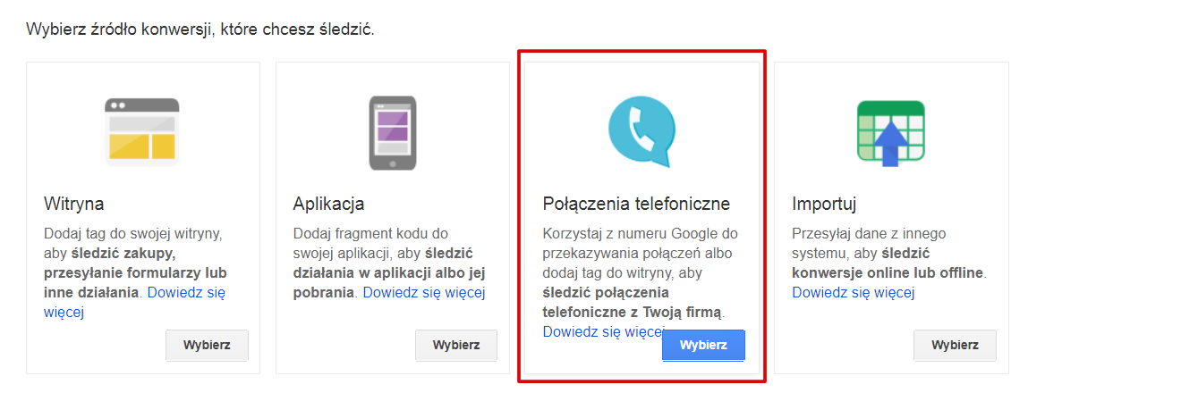 Następnie, wchodząc w zakładkę “Konwersje” dodajemy nową czynność, którą w tym przypadku będzie połączenie telefoniczne. Wybieramy odpowiedni rodzaj połączenia – a więc ‘Połączenia z reklam z wykorzystaniem rozszerzeń połączeń lub reklamy typu “tylko połączenie”’.