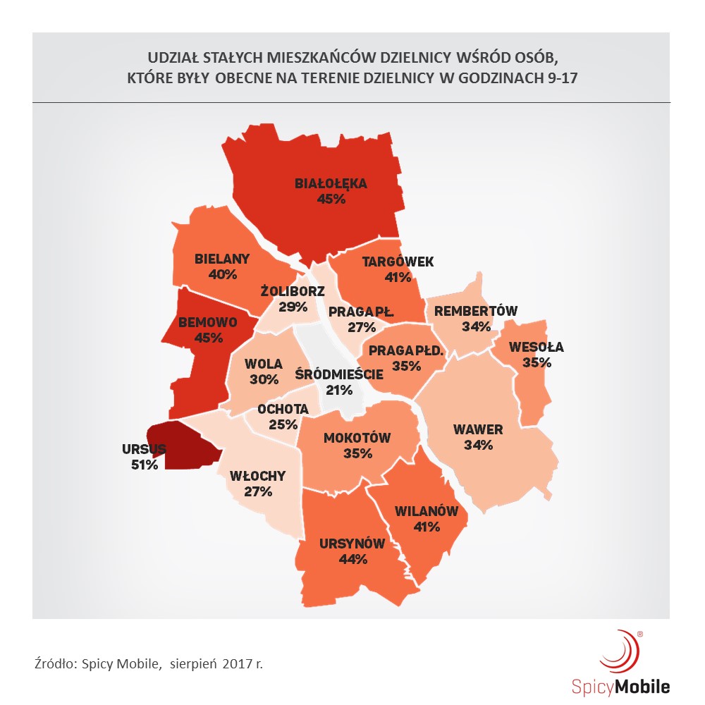 Na podstawie analizy przepływu ludności między dzielnicami Warszawy, agencja Spicy Mobile przygotowała ranking dzielnic, określając stosunek mieszkańców do osób z zewnątrz. Jak wynika z badania, na jednego mieszkańca Śródmieścia przypada aż pięciu odwiedzających. Dzielnice o dużym nasyceniu ludności przyjezdnej w stosunku do mieszkańców to również Ochota, Włochy, Praga Północ oraz Żoliborz. Z kolei dzielnicą o najmniejszym wskaźniku dobowej migracji ludności okazał się Ursus, wyprzedzając pod tym względem Bemowo i Białołękę.
