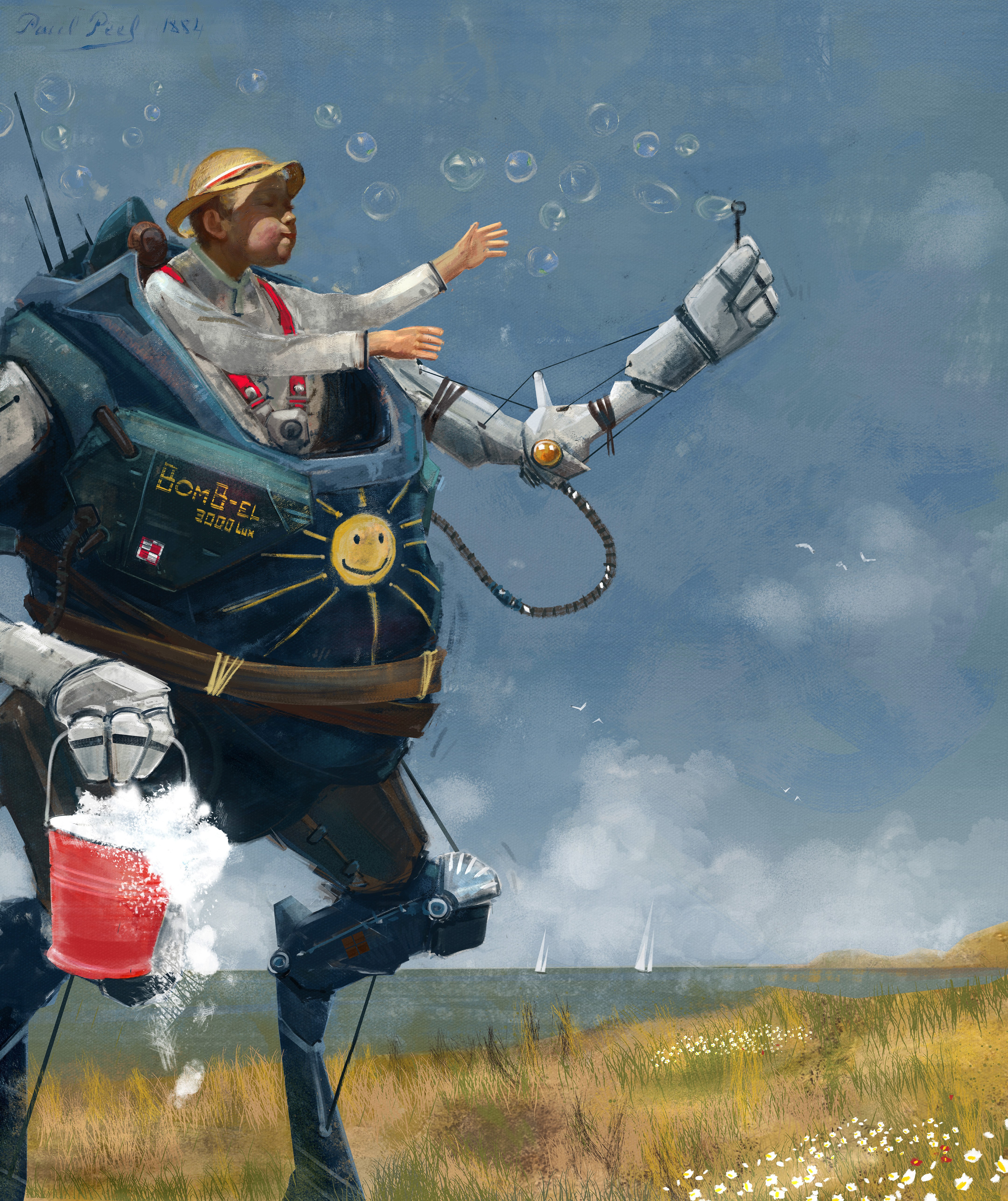 Dla mnie wybór obrazu Peela był oczywisty. Od razu wiedziałem co i jak chcę na nim namalować. Na początku jednak, wydrukowałem oryginał i ołówkiem naniosłem pierwszy szkic – mówi Damian Rojek, zwycięzca konkursu Microsoft Surface AntyLuwr. Cyfrową przeróbkę zrobiłem na tablecie graficznym. Namalowałem robota, czerwone wiaderko z płynem na bańki mydlane i tak wyszedł z tego futurystyczno-tradycyjny obraz – dodaje Damian Rojek.