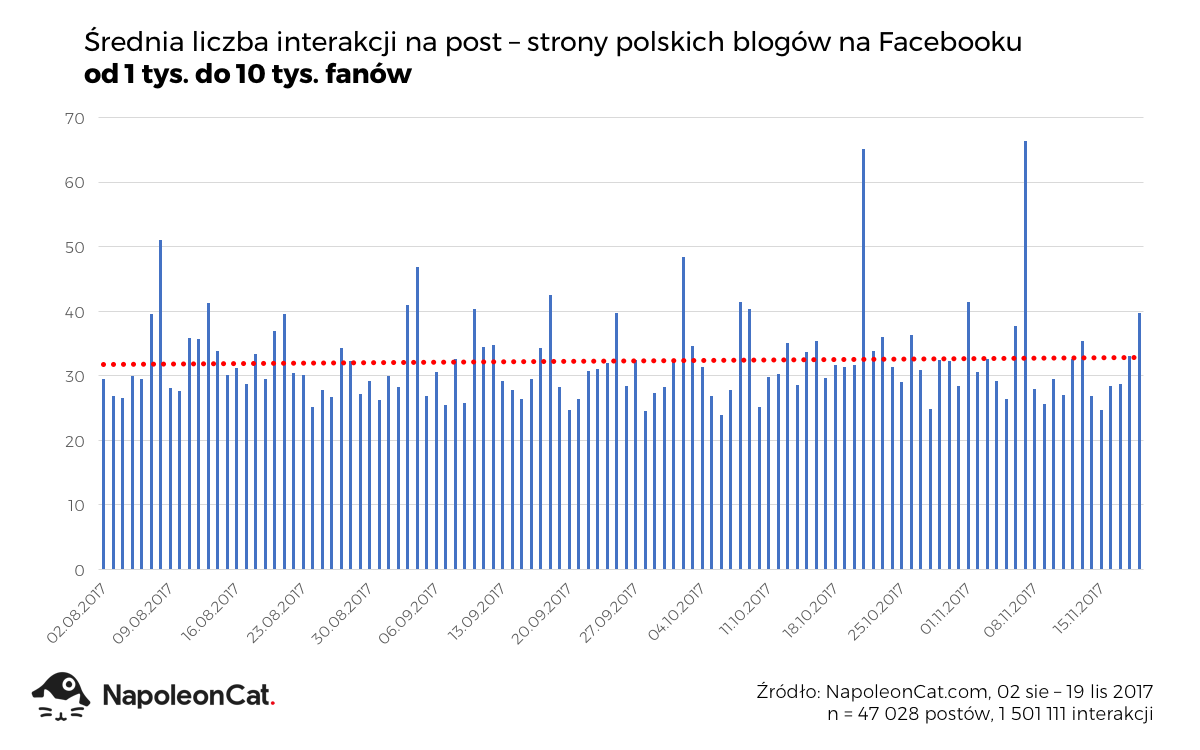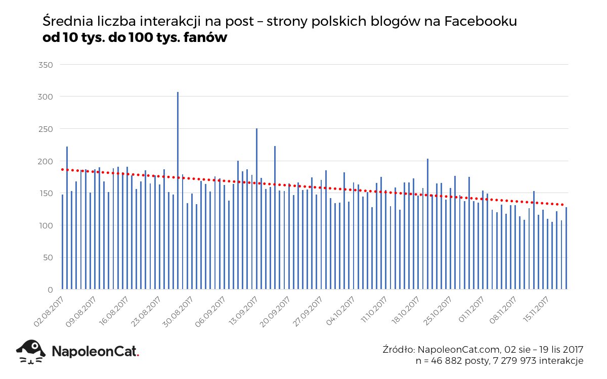 W bazie NapoleonCat znalazło się 496 stron blogów i influencerów, których liczba fanów wynosi od 10 do 100 tysięcy. W badanym okresie (02/08-19/11/2017) opublikowane zostały na nich 46 882 posty, które wygenerowały 7 279 973 interakcji. Łączna liczba fanów wzrosła z 14,6 miliona do 15,1 miliona, czyli o 3,4%. A jak wyglądała średnia liczba interakcji na post?