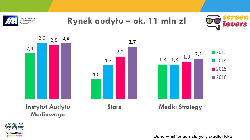 Rynek audytu mediowego ma obecnie wartość 11 mln zł – pokazują szacunki ScreenLovers na podstawie danych o przychodach lokalnych firm audytorskich. Największy w gronie lokalnych audytorów pozostaje Instytut Audytu Mediowego z 2,9 mln zł przychodów, a największą dynamikę wzrostu utrzymuje Stars, którego przychody wzrosły o ponad jedną piątą.