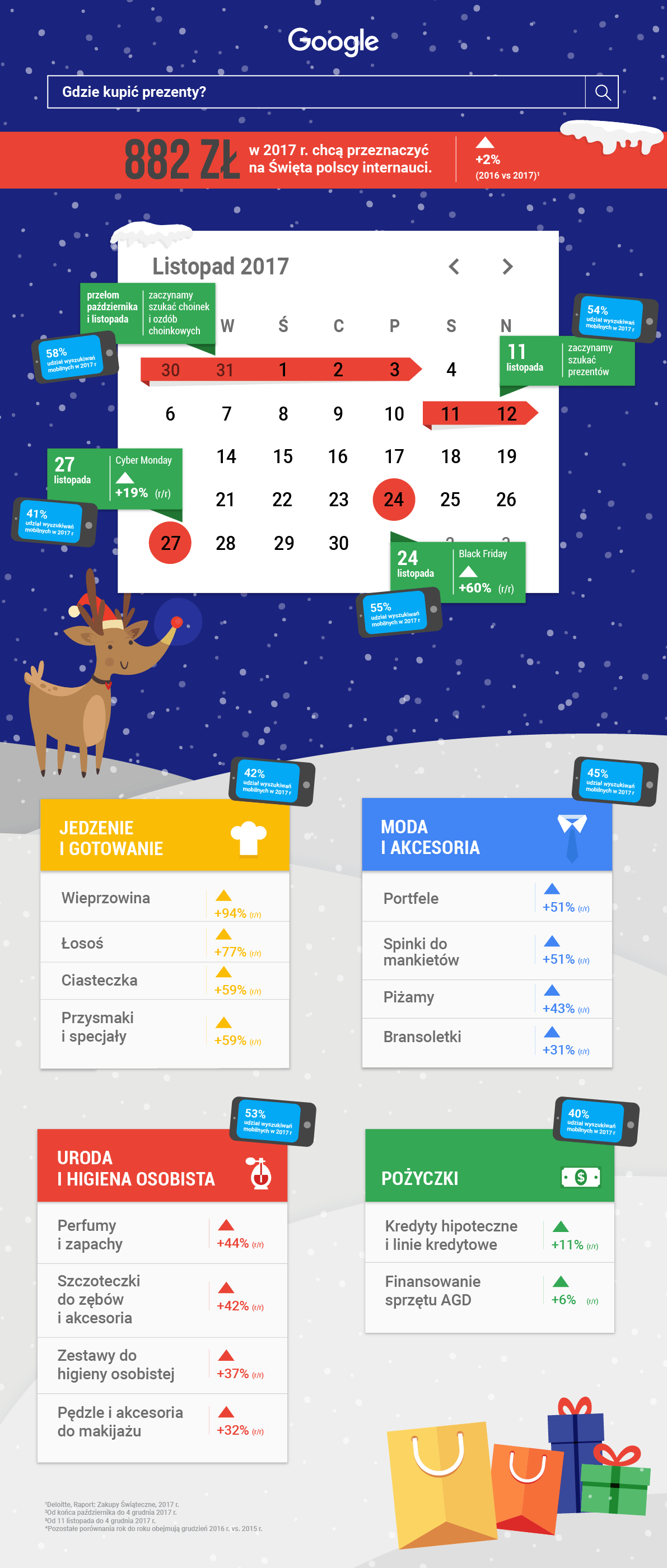 Jak co roku, zainteresowanie tematami okołoprezentowymi zaczęło się na długo przed samymi Świętami. W 2017 r. znaczący wzrost zapytań o prezenty nastąpił już 11 listopada. Do 4 grudnia br. 54% tych haseł wpisano z poziomu urządzeń mobilnych.2 W 2016 r. najwięcej wyszukiwań miało miejsce w połowie grudnia, a ostatni szczyt zapytań wypadł około 19 grudnia. Zaraz po świętach Polacy zaczęli rozglądać się za wyprzedażami, a ich największe zainteresowanie okazyjnymi cenami nastąpiło 27 grudnia. Warto zauważyć, że poszukiwania przed dokonaniem zakupu coraz bardziej przenoszą się do internetu. Liczba zapytań o prezenty wzrosła o 33%, a o wyprzedaże o 130% w ciągu roku.3