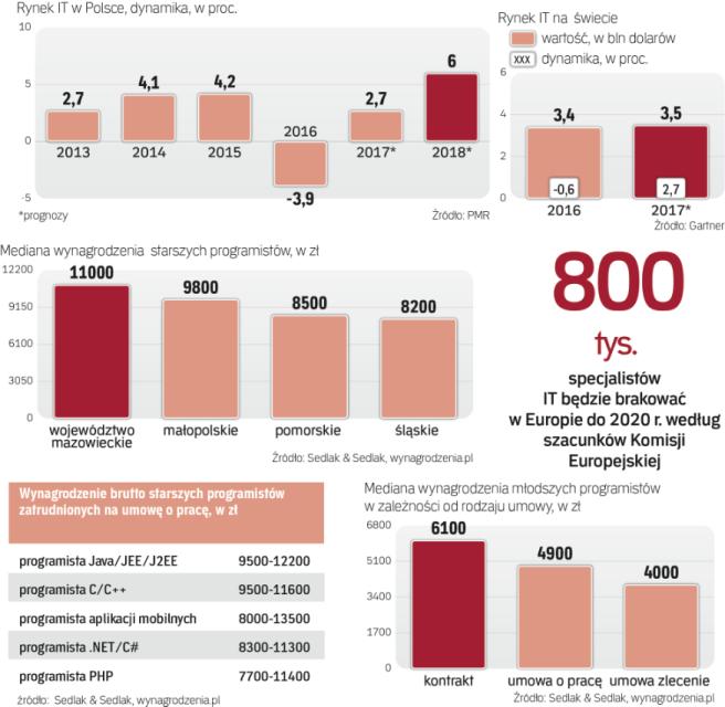 Od wielu lat mówi się o tym, że w Polsce brakuje osób zajmujących się programowaniem. Jak podaje Rzeczpospolita1, w naszym kraju istnieje od 30 do 50 tysięcy wolnych wakatów, a w całej Unii Europejskiej aż 500 tysięcy. Prognozy nie są optymistyczne – przewidywane zapotrzebowanie na specjalistów z branży IT w 2020 roku sięga 800 tysięcy stanowisk. Powoli staramy się nadążyć za nowymi wymaganiami systemu. Coraz większy nacisk kładzie się na naukę kodowania już od najmłodszych lat – obecnie wiedzę z tego zakresu przyswajają nawet dzieci w podstawówkach. Pozostaje nam czekać, aż dorosną i wkroczą na rynek pracy. Obecny niedobór rodzimych specjalistów skutkuje zatrudnianiem pracowników zza granicy. W ciągu ostatnich dwóch lat nastąpił prawie dwukrotny wzrost zatrudnienia obcokrajowców w polskich filiach międzynarodowych korporacji.