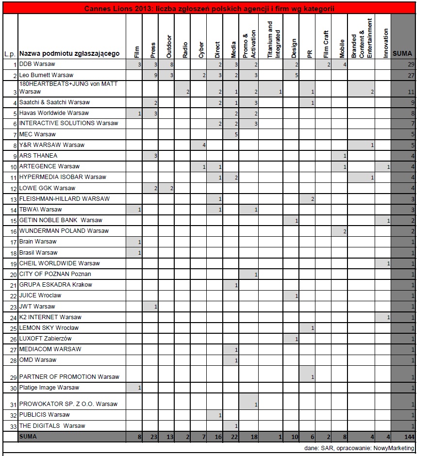 Nagrody w Cannes mają szansę zdobyć m.in. DDB Warszawa (29 zgłoszeń), Leo Burnett Warsaw (27 zgłoszeń), 180HEARTBEATS+JUNG von MATT (11 zgłoszeń), Saatchi & Saatchi (9 zgłoszeń), Havas Worldwide (8 zgłoszeń), Interactive Solutions (7 zgłoszeń) oraz MEC i Young & Rubicam (po 5 zgłoszeń). Zgłoszenia przesłał także Getin Bank oraz Miasto Poznań.