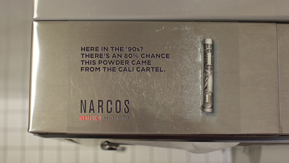 Z kolei z okazji premiery trzeciego sezonu serial Narcos, Netfil stworzył kilka dobrych akcji reklamowych, w których agencja DonerLA umieszcza reklamy w łazienkach klubów i barów, gdzie klienci w latach 90. konsumowali towar kartelu Cali.