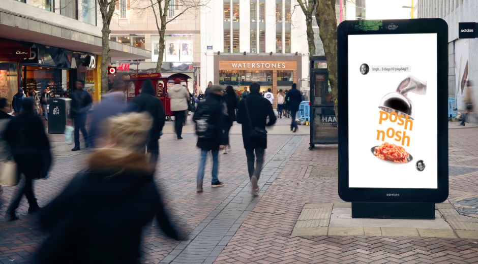 Dostosowywanie treści do czasu i miejsca jej wyświetlania to bardzo ciekawe rozwiązanie, które jest szczególnie atrakcyjne dla marek spożywczych. Doskonałym przykładem użycia tego typu możliwości jest kampania przeprowadzona przez sieć hipermarketów Sainsbury’s w Wielkiej Brytanii. Firma ta w swojej jesiennej kampanii zachęcała osoby wracające z pracy do wstąpienia do sklepu ich marki na zakupy. W kampanii wyświetlano dialogi prowadzone między bliskimi na temat tego, co zjeść na obiad. Reklamę emitowano w godzinach popołudniowych w miejscach o dużym natężeniu ruchu, w tym m.in. w centrach handlowych i dworcach kolejowych.