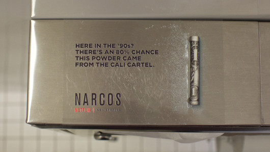 W związku z premierą kolejnego sezonu serialu Narcos, Netflix umieścił sprytne reklamy w łazienkach klubów i barów, gdzie klienci w latach 90. konsumowali towar kartelu z Cali.