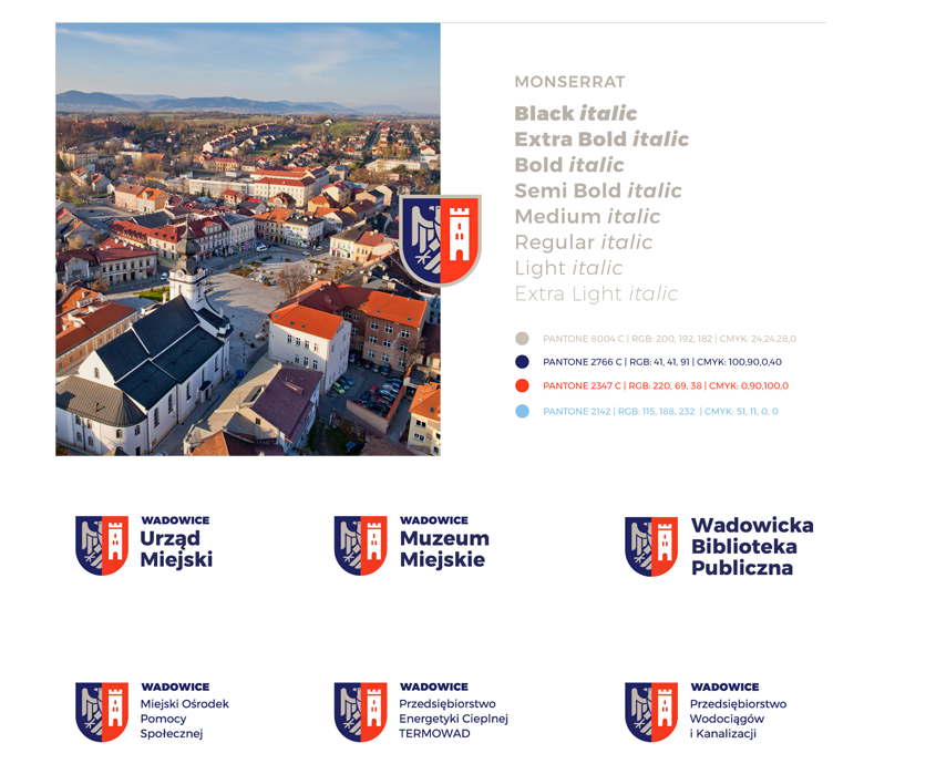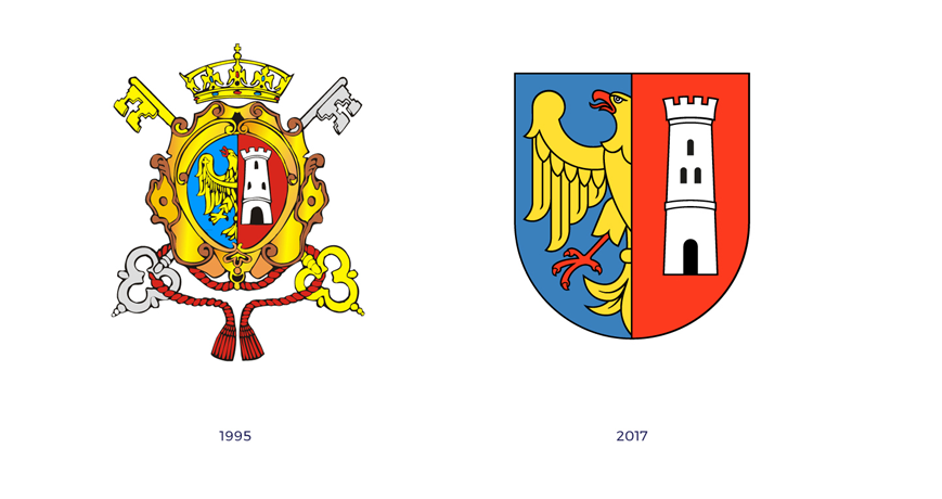 Od 1995 roku miasto posługiwało się herbem, do którego, nieco na siłę, zostały dodane papieskie klucze – rozwiązanie zrozumiałe, z punktu widzenia historii miasta, natomiast niezgodne z zasadami heraldyki terytorialnej. Ładnie z tego problemu wybrnęło Studio Otwarte, które za punkt wyjścia przy tworzeniu rebrandingu obrało miejski symbol heraldyczny. Nie zrezygnowało całkowicie z papieskich kluczy – występują one w wersji podstawowej znaku, jednak są one usuwane w momencie oznakowania jednostek urzędowych. Dobór kolorów, uproszczenie znaku i brak szafowania kluczami, tworzy naprawdę ciekawy wynik.
