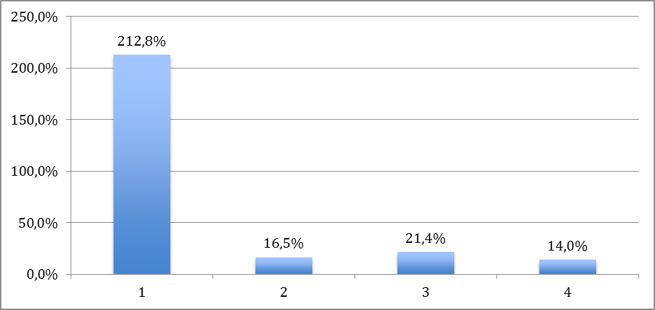 Wykres: Kolumna nr 1 przedstawia średni zasięg postów dla fanpage’a posiadającego około 100 fanów, kolumna nr 2 to fanpage posiadający ok. 1000 fanów, kolumna nr 3 to fanpage z 10 000 fanów, a kolumna nr 4 to fanpage posiadający ok. 100 000 fanów. (oprac. własne)