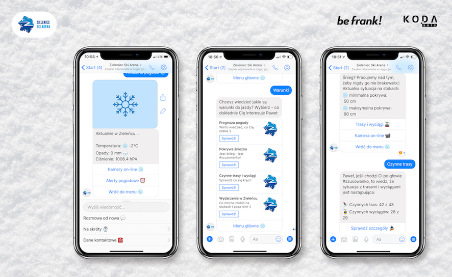 By z niego skorzystać wystarczy wejść na Messengera Zieleniec SKI Areny, kliknąć “rozpocznij” i dowiedzieć się więcej. Chatbot zawiera aktualne dane pogodowe ze stacji meteo w Zieleńcu i prognozę z najbardziej wiarygodnego źródła. Odpowiada także na pytania użytkowników dotyczące dostępnych tras, wyciągów, cennika, warunków na stokach, regulaminu, a nawet czynnych restauracji czy bazy hotelowej. Dzięki integracji z serwisem www.zieleniec.pl, do którego najczęściej linkuje, posiada bieżące informacje na temat wydarzeń odbywających się na terenie ośrodka i zmian zachodzących na stokach. – Z wdrożeniem chatbota nie było najmniejszego problemu – odpowiada Mariusz Pełechaty, creative director w KODA Bots, twórcy rozwiązania – Zieleniec od początku był otwarty na współpracę i nie bał się naszych pomysłów. Dzięki danym, które otrzymaliśmy, udało nam się stworzyć bardzo sprawnie działający kanał komunikacji z użytkownikami, bo chatbot powstał właśnie z myślą o narciarzach, snowboardzistach i w ogóle turystach przyjeżdżających do Zieleńca. – dodaje Pełechaty.