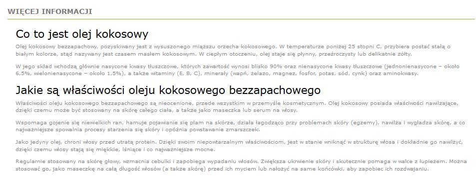 Systematycznie tworzenie opisów kategorii i produktów bardzo dobrze wpływa na pozycjonowanie i rozbudowę ruchu z tzw. długiego ogona (long tail). Przyczyni się to do zwiększenia ruchu w sklepie internetowym. Dobrze napisany opis, który dostarczy cennych informacji o produkcie, to duża wartość dodana dla osoby zastanawiającej się nad zakupem. W przypadku mniejszej liczby produktów warto stworzyć krótki zachęcający do zakupu opis dla każdego produktu. W przypadku większej liczby produktów może to być trudne, dlatego wówczas można posiłkować się pomocą agencji lub copywriterów.