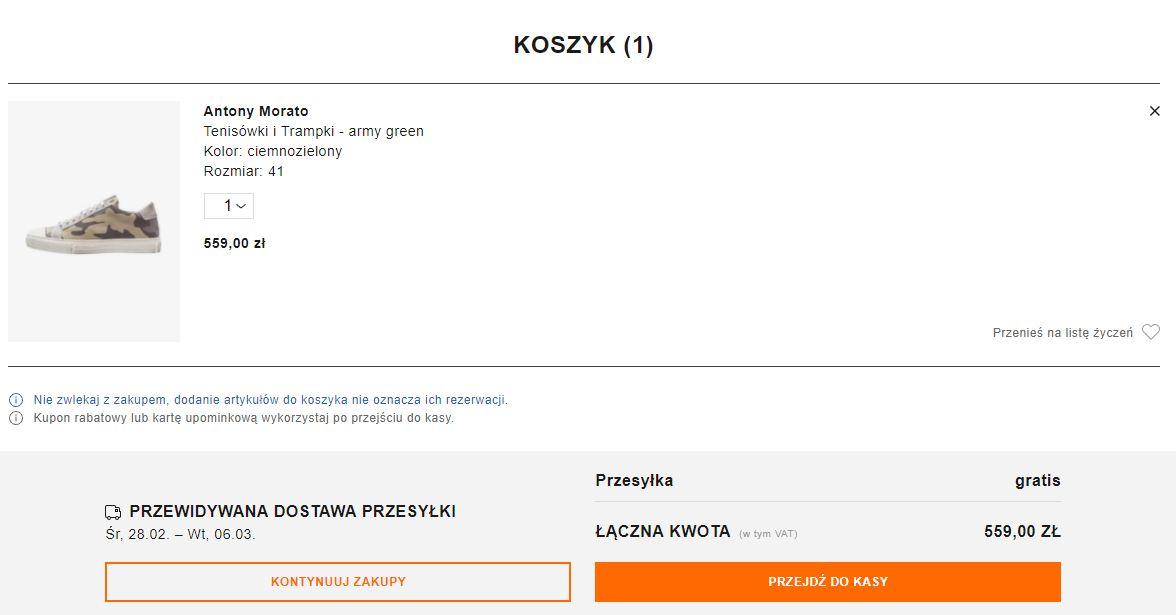 Choć trudno w to uwierzyć, to w niektórych sklepach aż 60% klientów opuszcza sklep na etapie przechodzenia przez koszyk zakupowy! Przyczyn porzuceń koszyka jest wiele. Są to między innymi: brak informacji o formie i kosztach dostawy, wysokie koszty dostawy, niechęć do zakładania konta, zbyt skomplikowany proces realizacji zamówienia, brak pożądanej możliwości dokonania płatności, brak wystarczających informacji dotyczących zakupu i wiele innych. Dlatego można spokojnie stwierdzić, że jeśli poświęcisz co najmniej kilka godzin na analizę procesu przejścia przez koszyk w swoim sklepie, to żadna z nich nie będzie zmarnowana. Zadbaj o to, by był przejrzysty i zawierał informacje najważniejsze dla kupującego.