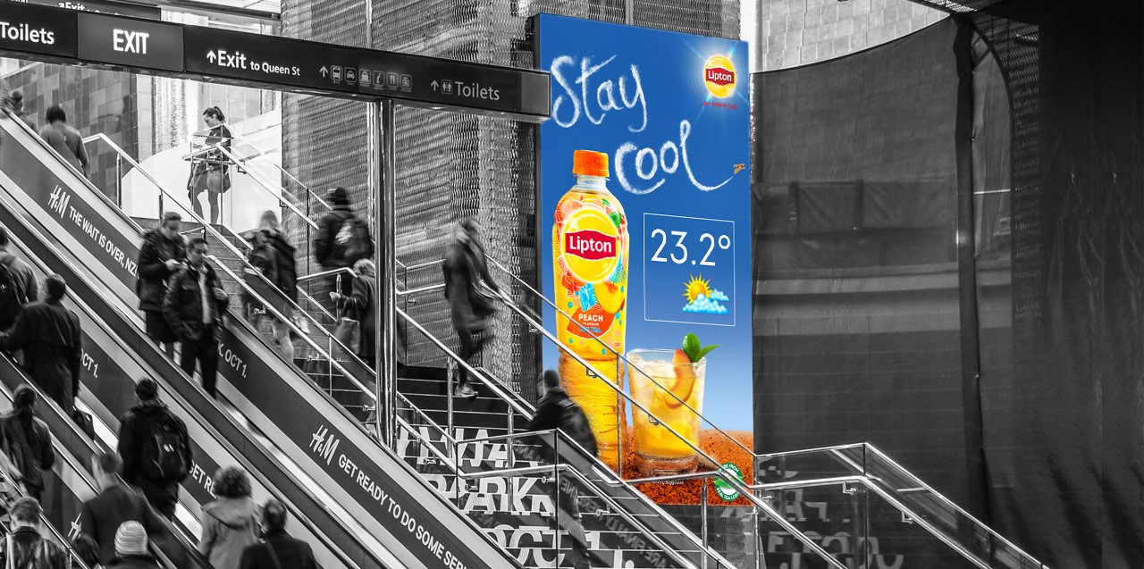 Jedną z firm wykorzystujących możliwość warunkowania pogodą w swojej reklamie DOOH jest producent znanej wszystkim herbaty mrożonej Lipton. Celem kampanii było wzbudzenie pragnienia u osób dojeżdżających do pracy przez stację Britomart w Auckland. Spoty reklamowe przedstawiały pyszną i orzeźwiającą herbatę z lodem. Na ekranie wyświetlano dodatkowo informacje dotyczące aktualnego stanu pogody oraz wilgotności powietrza. Wyświetlane spoty reklamowe były na bieżąco dopasowywane do zmieniających się warunków atmosferycznych. Jeśli wilgotność powietrza wzrosła, herbata z lodem stawała się jeszcze bardziej orzeźwiająca!