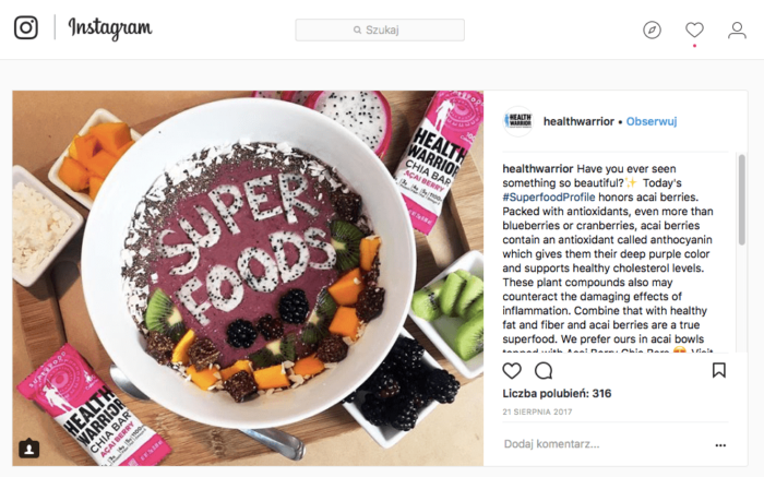 Edukacyjny content marki Health Warrior Superfoods na Instagramie, na temat właściwości jagód acai stanowiących składnik batonów marki.