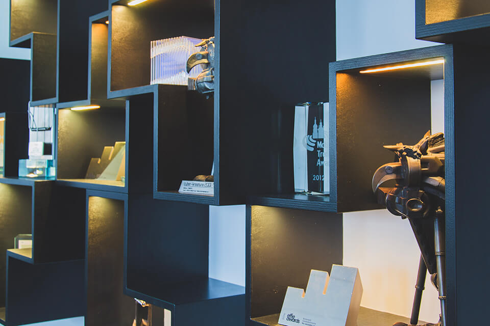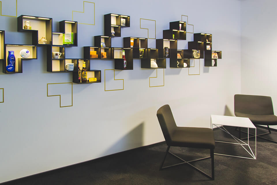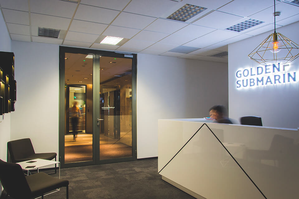 Wnętrza GoldenSubmarine to całe pokłady kreatywności i pozytywnej energii. Przestrzeń została utrzymana w tonacji bieli i czerni z delikatnymi złotymi detalami. Poszliśmy z duchem czasu i postawiliśmy na elegancki minimalizm. Już od pierwszego przekroczenia naszego progu widać go w nowym podświetlonym logo. Prosty napis ze znakiem graficznym w postaci sygnetu w kształcie peryskopu symbolizuje nowe perspektywy i śmiałe spojrzenie w przyszłość, która rysuje się przed nami naprawdę świetnie. A wiszące naprzeciwko półki z kolekcją gadżetów i produktów, związanych z głównymi markami z naszego portfolio, swoim kształtem peryskopu kontynuują wprowadzoną symbolikę i znakomicie oddają klimat utrzymany we wszystkich pomieszczeniach.