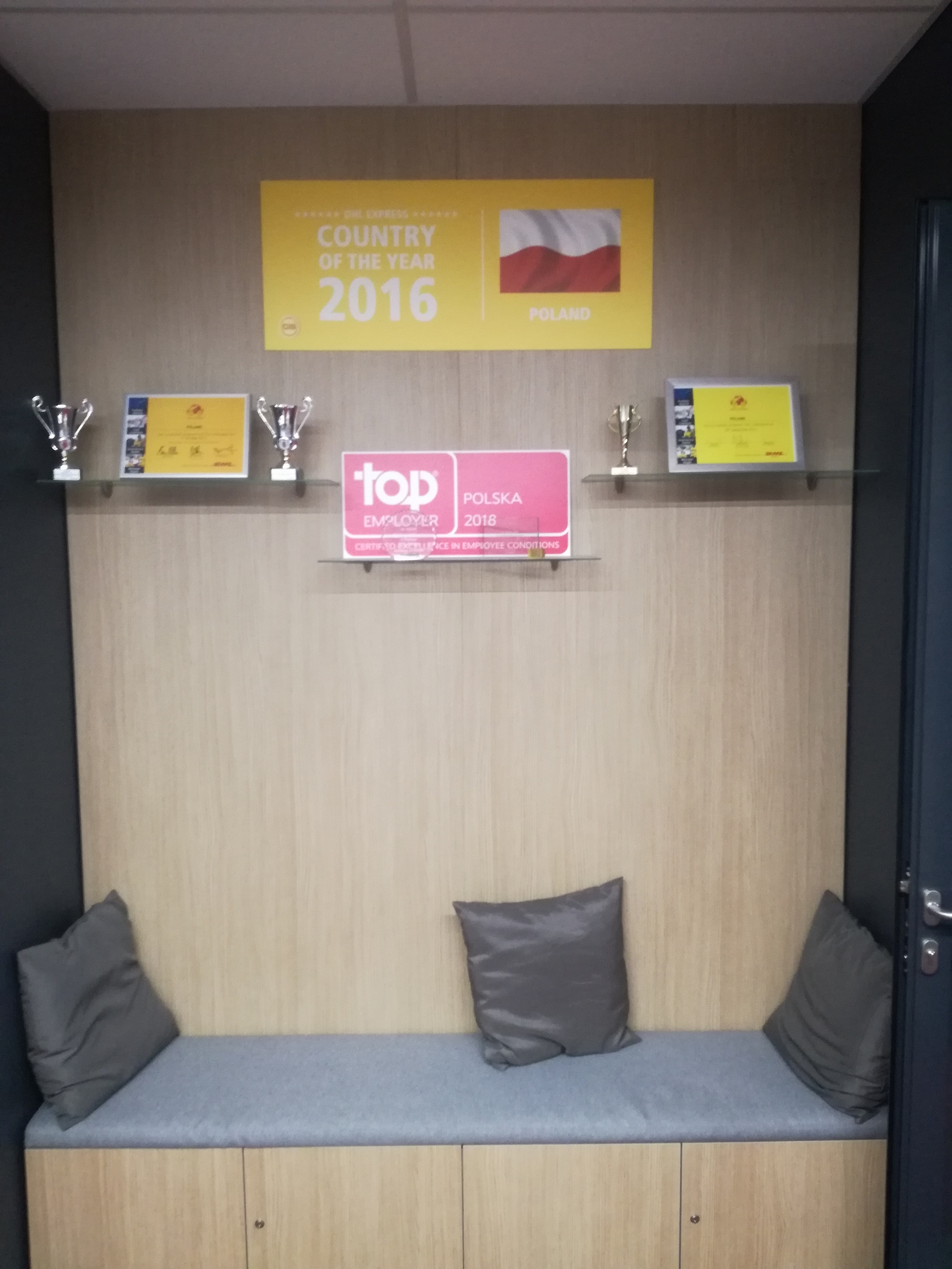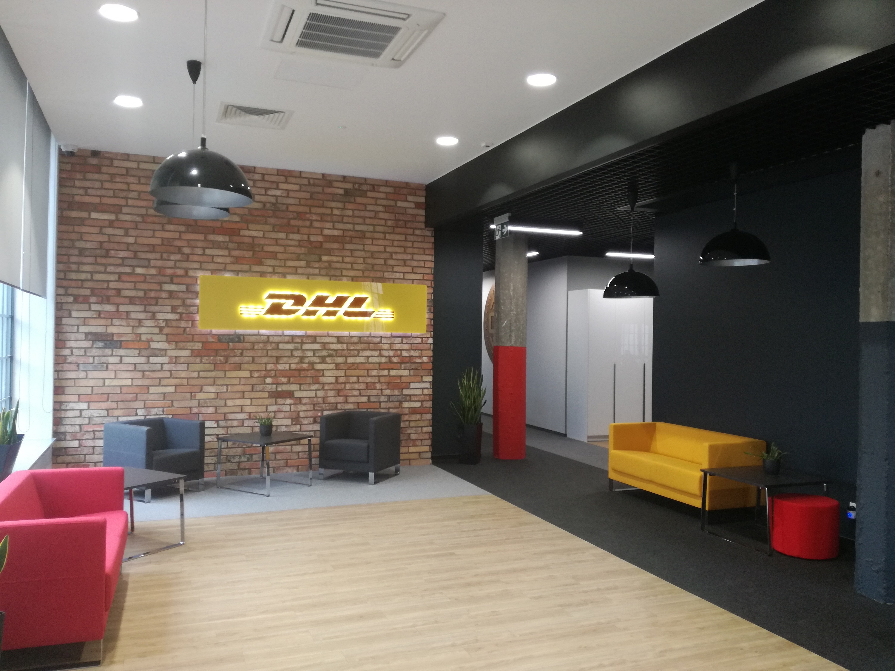 Pofabryczny charakter biura i nawiązanie kolorystyką do żółtoczerwonego logotypu, dodatkowo podkreślają DHL-owość tego miejsca i nierozerwalną więź z Łodzią. Jest funkcjonalnie, ale przytulnie, w czym pomaga obecność naturalnych roślin w całym biurze. Każdy pracownik posiada własne biurko i szafkę do przechowywania osobistych przedmiotów. Trudno nie zauważyć wyeksponowanych na ścianie statuetek, potwierdzających sukcesy pracy zespołowej. W biurze znajduje się wiele kanap, puf, foteli i stolików, czy też przytulnych wnęk do nieoficjalnych spotkań, gdzie można usiąść, napić się kawy z ekspresu, porozmawiać.