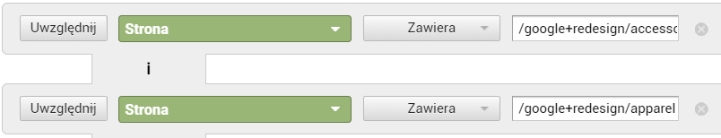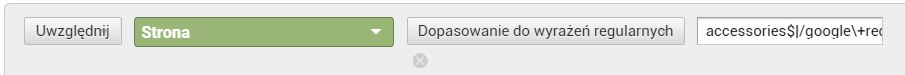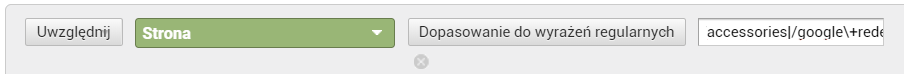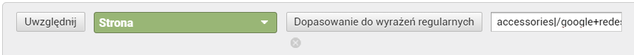 Taka konfiguracja nie zwróci żadnych danych. Spróbujmy zatem użyć wyrażenia regularnego z przykładu pierwszego. Wybieramy kolejno opcje Uwzględnij Strona Dopasowanie do wyrażeń regularnych i wpisujemy w polu wyszukiwania: google+redesign/apparel|/google+redesign/accessories, czyli dwie strony, dla których chcemy otrzymać dane, oddzielone znakiem specjalnym „|”.