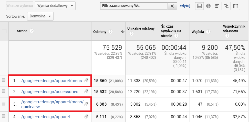Celem było wyfiltrowanie danych dotyczących kategorii, a otrzymaliśmy również podkategorie (zaznaczone na powyższym screenie na czerwono). Dzieje się tak, ponieważ wyrażenia regularne są wyrażeniami zachłannymi. Bez dodatkowej konfiguracji otrzymujemy dane nie tylko dla strony /google+redesign/apparel, ale także dla wszystkich stron, które zawierają tę ścieżkę i ciągi znaków przed nią lub po niej, np. /google+redesign/apparel/mens.