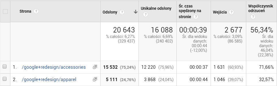 Załóżmy teraz, że chcemy sprawdzić wyniki dla dwóch konkretnych stron, w tym przypadku – kategorii produktów „Apparel” i „Accessories”. Wiemy już, że nie możemy wyszukać ich, wpisując: