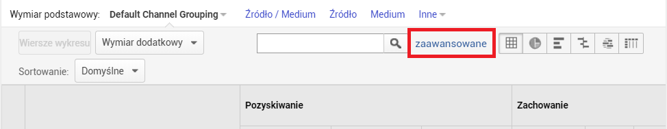 Przypuśćmy, że chcemy otrzymać tabelę z danymi o ruchu z kanału Direct. Klikamy zatem w „zaawansowane” obok pola wyszukiwania.