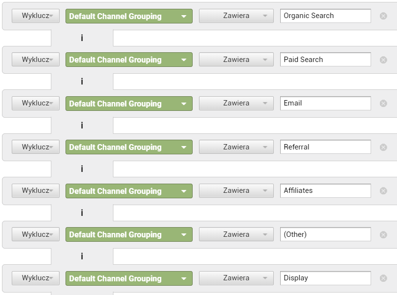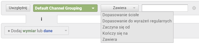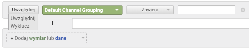 W pierwszym kroku wybieramy pomiędzy opcjami „Uwzględnij” i „Wyklucz”, a następnie wymiar lub metrykę, którą chcemy uwzględnić lub wykluczyć. Na potrzeby naszego przykładu wybieramy Uwzględnij Default Channel Grouping (czyli Domyślne grupowanie kanałów).