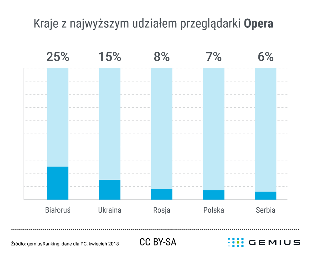 W kwietniu 2018 roku Opera była trzecią najpopularniejszą przeglądarką w polskiej sieci – za jej pomocą internauci wykonali 7 proc. odsłon. Tym samym Polska zajęła czwarte miejsce w rankingu krajów z największym udziałem odsłon wygenerowanych za pomocą Opery. Okazuje się, że ta przeglądarka największą popularnością w analizowanym miesiącu cieszyła się na Białorusi (25 proc.). Drugie miejsce zajęła Ukraina z wynikiem 15 proc. W pozostałych krajach, które zostały poddane analizie, udział tej przeglądarki nie przekraczał dwucyfrowego progu. W Rosji wyniósł 8 proc., a w Serbii 6 proc. Okazuje się, że wśród analizowanych krajów Opera była najrzadziej używana w Luksemburgu ¬– udział był mniejszy niż 1 proc.