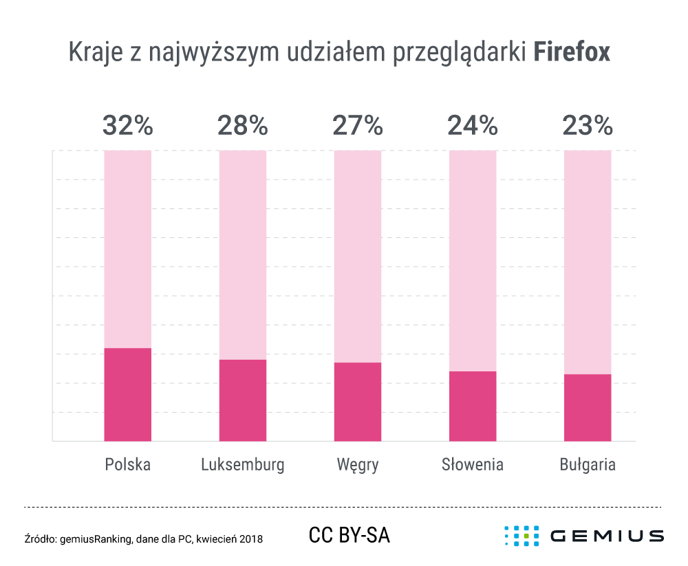 W kwietniu bieżącego roku polscy internauci wykonali za pomocą przeglądarki Firefox 32 proc. odsłon. Oznacza to, że Polska zajmuje pierwsze miejsce wśród krajów z największym udziałem odsłon wygenerowanych przez tę przeglądarkę. Drugie miejsce na podium przypadło Luksemburgowi (28 proc.), gdzie w kwietniu 2018 roku Firefox był najpopularniejszą przeglądarką. Tuż za Luksemburgiem znalazły się Węgry (27 proc.), a dwa ostatnie miejsca w rankingu należały do Słowenii i Bułgarii (kolejno 24 proc. i 23 proc.). Najmniejszą liczbę odsłon wykonanych za pomocą przeglądarki Firefox odnotowano w Turcji (4 proc.).