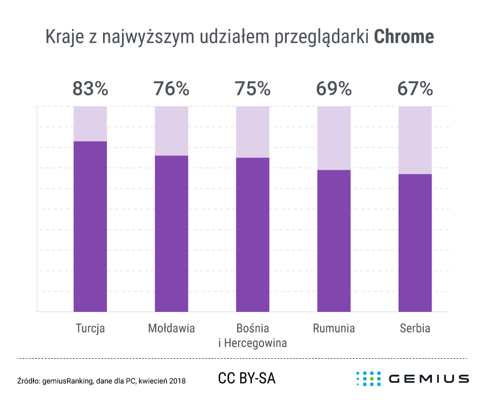 Z analizy wynika, że przeglądarka Chrome jest najpopularniejsza nie tylko w Polsce, ale również w takich krajach, jak: Turcja, Mołdawia, Bośnia i Hercegowina, Rumunia i Serbia. Największy udział przeglądarka Google’a odnotowała w Turcji – 83 proc. odsłon w sieci wykonano za jej pomocą. Drugie miejsce zajęła Mołdawia z udziałem 76 proc., a trzecie – Bośnia i Hercegowina (75 proc.). Kolejne miejsca przypadły Rumunii (69 proc.) oraz Serbii (67 proc.). Najmniejszą popularnością przeglądarka Chrome cieszyła się w Luksemburgu (27 proc.). Luksemburg był również jedynym krajem, w którym Google Chrome nie znalazł się na pierwszym miejscu w rankingu, ponieważ miejsce to przypadło przeglądarce Firefox (28 proc.).