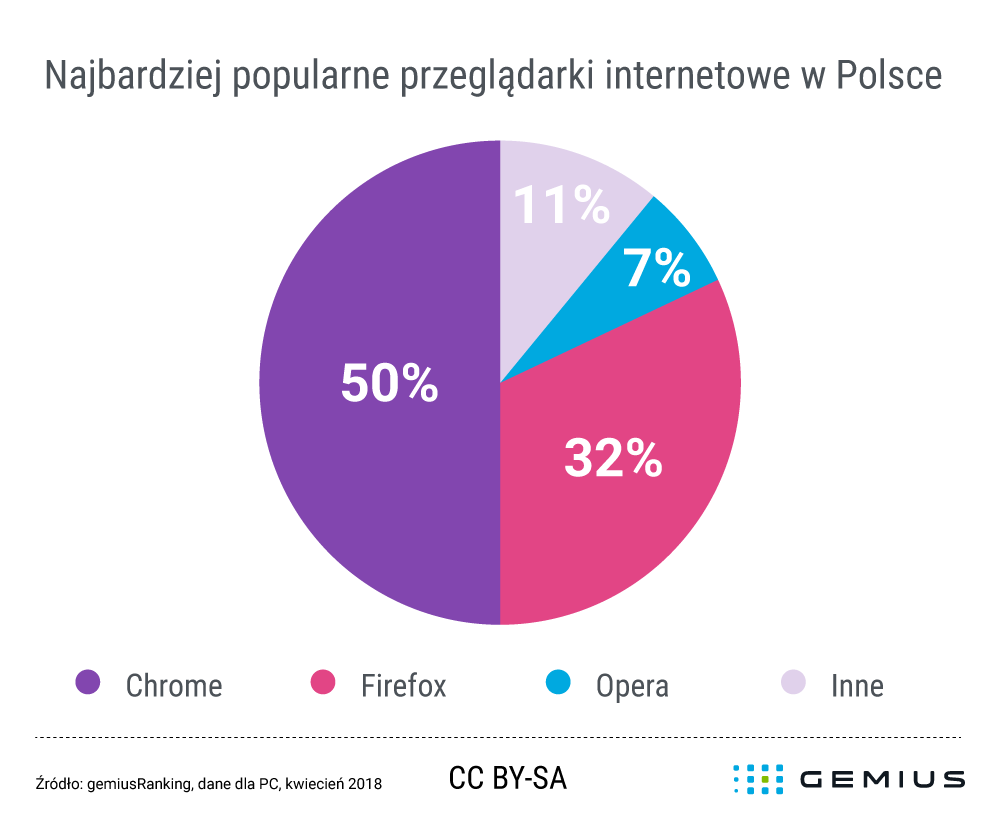 W Polsce liderem wśród przeglądarek dostępnych na komputerach osobistych i laptopach w kwietniu był Chrome. Korzystając z przeglądarki Google’a, wygenerowano 50 proc. wszystkich odsłon na komputerach osobistych i laptopach. Natomiast za pomocą Firefoxa wykonano 32 proc. odsłon. Ranking top 3 najpopularniejszych przeglądarek w Polsce zamyka Opera, która ma 7 proc. udziału w liczbie wygenerowanych odsłon.