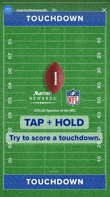 Pablo Rochat jest jedną z najbardziej kreatywnych osób, tworzących różne zabawy na Instagramie i w Stories. Dla marki Marriott Rewards na czas NFL stworzył uzależniającą grę, w której został wykorzystany drugi rodzaj interakcji, czyli „tapnij i przytrzymaj”, co powoduje zastopowanie obrazu (pauza). Należało umieścić footballową piłkę w odpowiednim polu. Ten pomysł można łatwo zaadaptować do wielu innych aktywności: dopasowywania, celowania, tworzenia kombinacji itp.
