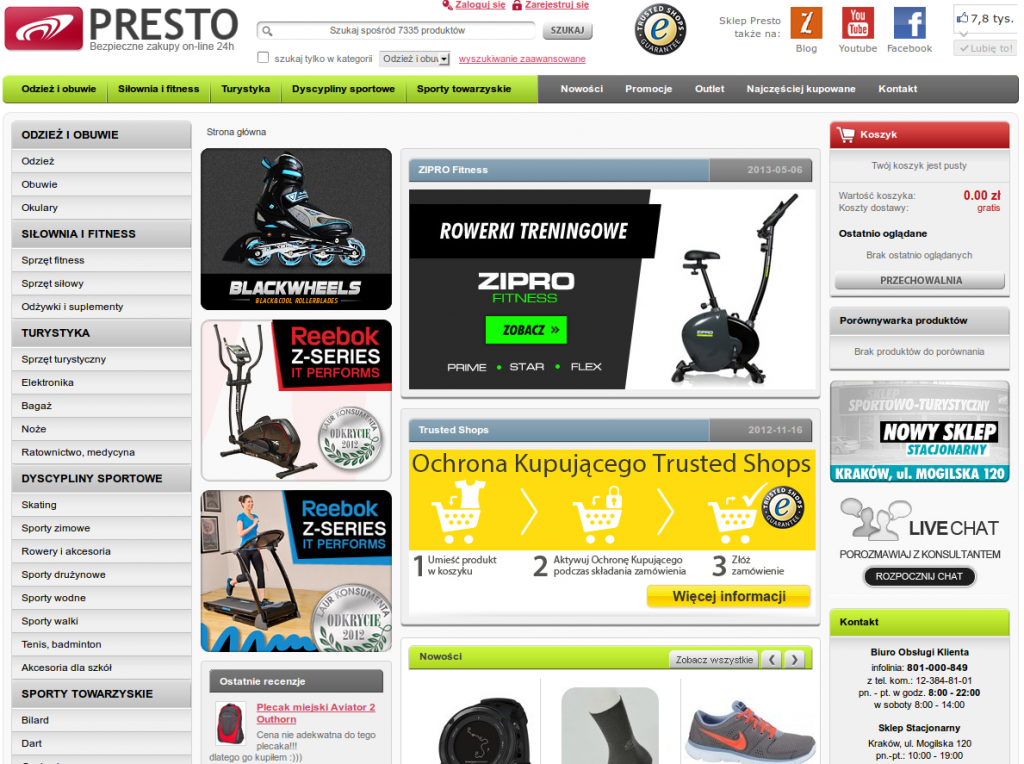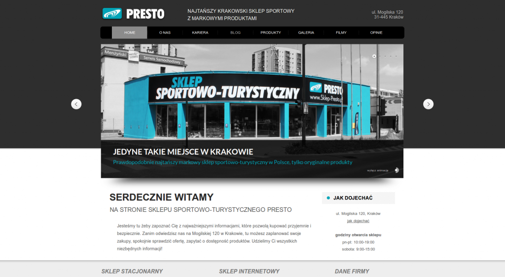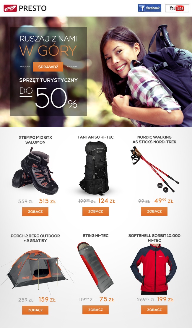 WWW.SKLEP-PRESTO.PL powstał w 2004 roku i znajduje się w czołówce e-sklepów w branży sportowo-turystycznej w Polsce. Doświadczenie, które posiadamy pozwala nam wytyczać nowe kierunki we współpracy z partnerami handlowymi oraz kreować wzorcowy model kontaktów z klientem. Naszą receptą na sukces jest otwarcie na innowacyjne rozwiązania wychodzące naprzeciw oczekiwaniom współpracowników, szybkie reagowanie na zmieniające się trendy e-commerce, a przede wszystkim rzetelność i niezawodność. PRESTO tworzy zespół kilkudziesięciu wykwalifikowanych pracowników, liderów w swoich dziedzinach, dzięki którym oferujemy najwyższą jakość usług.