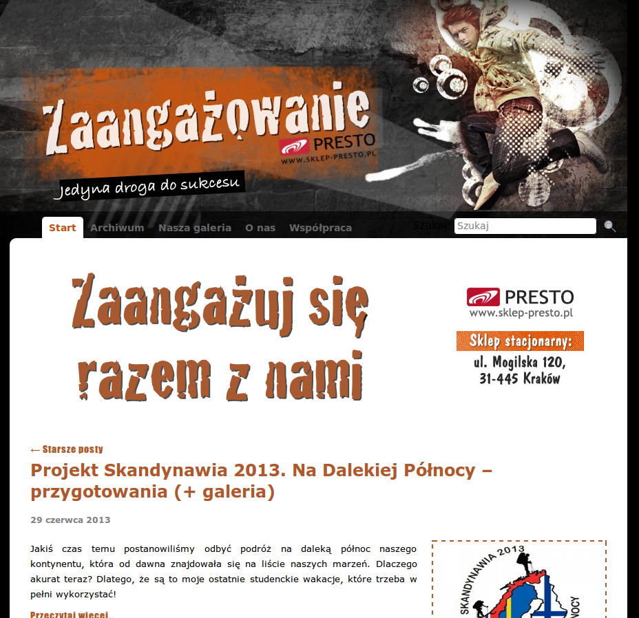 Prowadzimy bloga firmowego: blog.sklep-presto.pl, skupiającego się na pokazywaniu pasji i zaangażowaniu ludzi. Lubimy angażować się w przedsięwzięcia, w których widać pełne oddanie sprawie. Wspieramy motocyklistów, miłośników gór, trekkingowców, rowerzystów, offroadowców, a także lokalne kluby sportowe. Sponsorujemy wyprawy, fundujemy sprzęt turystyczny, pomagamy promować przedsięwzięcia.