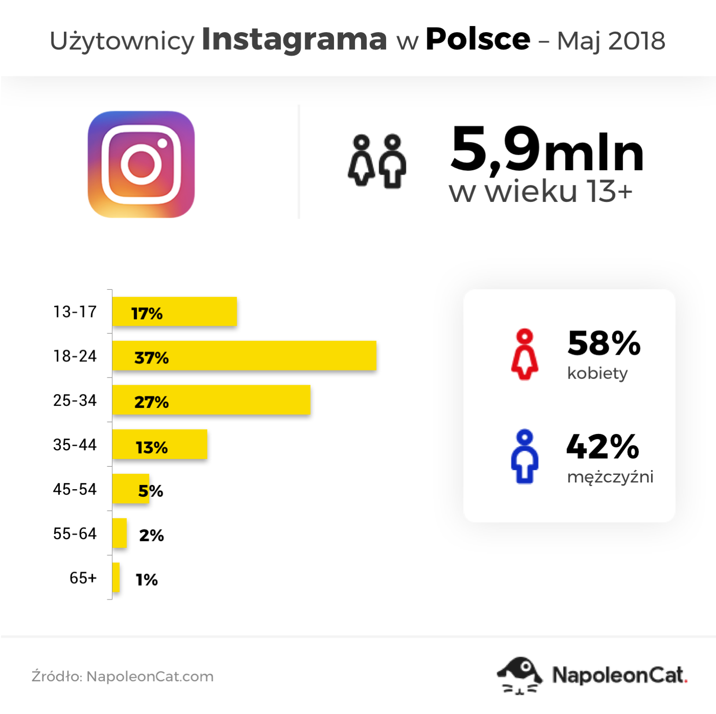 Ostatnią platformą poddaną analizie jest Instagram, z którego korzysta 5,9 mln Polaków. Największą grupą użytkowników, stanowiącą 37%, są osoby w wieku 18 – 24 lata. Na drugiej pozycji znalazły się osoby pomiędzy 24 a 35 rokiem życia, z wynikiem 27%. Dużym zaskoczeniem może być grupa zamykająca podium, czyli użytkownicy w wieku 13 – 17 lat, którzy stanowią 17% społeczności aplikacji. Głównymi użytkownikami Instagrama w Polsce są kobiety – 58%. Natomiast z Instagrama rzadziej korzystają mężczyźni, których jest 42%.