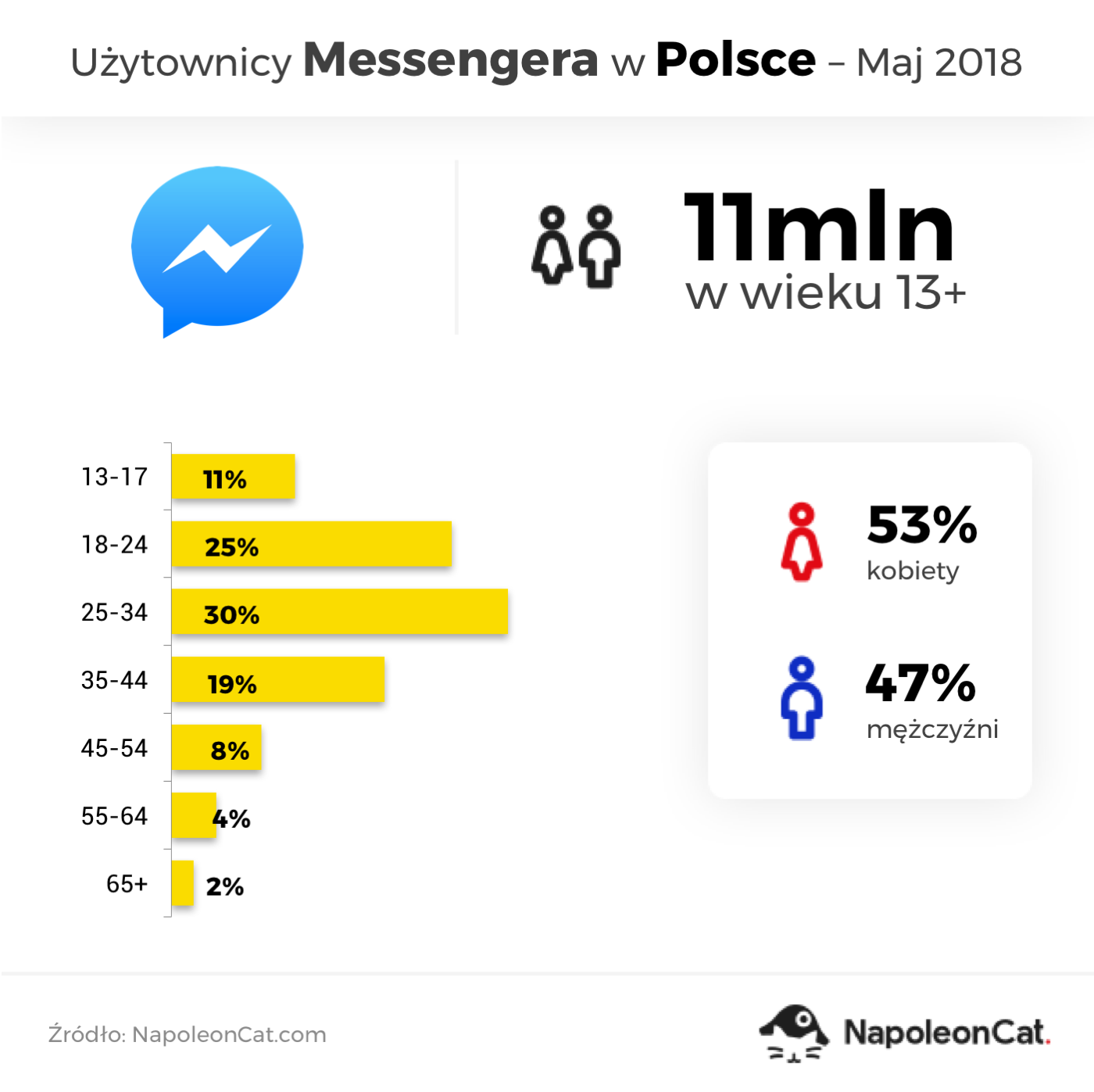 Drugą platformą pod względem liczby użytkowników jest Messenger. Korzysta z niej 11 milionów Polaków. Podobnie jak w przypadku Facebooka, największą grupą, stanowiącą 30% są osoby pomiędzy 25 a 34 rokiem życia. Z aplikacji korzysta 25% użytkowników w wieku 18 – 24 lata. Na trzecim miejscu, z wynikiem 19% plasują się osoby pomiędzy 35 a 44 rokiem życia. Aplikację posiada 53% kobiet i 47% mężczyzn.
