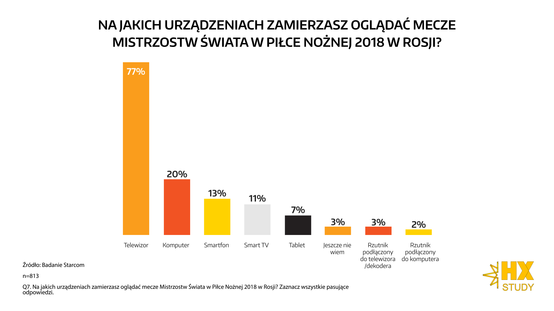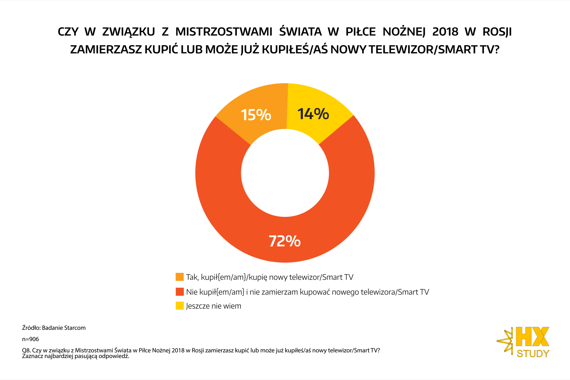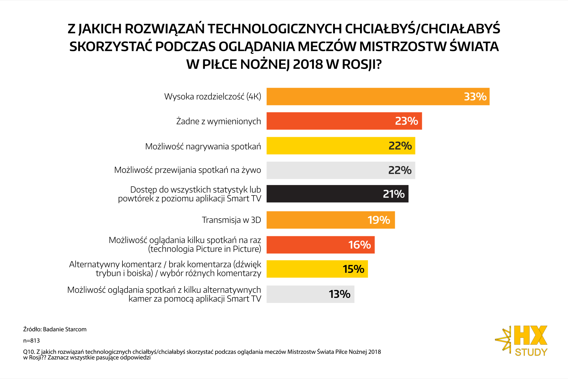 Imprezy takie jak mistrzostwa świata są często impulsem do zmiany telewizora. Na zakup nowego odbiornika TV z okazji mundialu w Rosji zdecydowało się 15% badanych, a 14% jeszcze tego nie wie, co może wskazywać na to, że rozważają taki zakup. Dodatkowym motywatorem do zmiany jest nieustanny rozwój technologii i możliwości współczesnych Smart TV. Co trzeci ankietowany wskazuje, że najbardziej byłby zainteresowany możliwością oglądania meczów w technologii 4K. Na kolejnych miejscach pojawiły się rozwiązania pozwalające na nagrywanie i przewijanie transmisji oraz dostęp do statystyk.