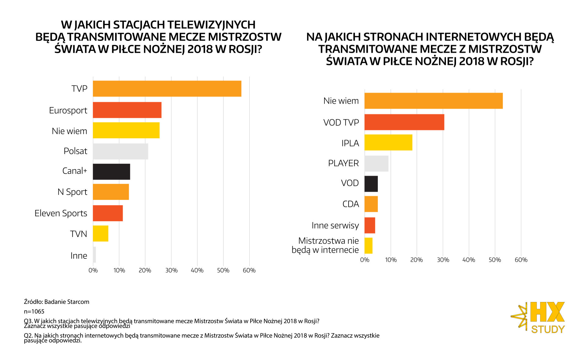 Aż 77% badanych zamierza oglądać mistrzostwa w domu przed telewizorem. Zaskakuje jednak to, że w przededniu MŚ 2018 spora grupa Polaków nadal nie wie dokładnie w jakich stacjach będą transmitowane spotkania. W przypadku telewizji, 56% wie że rozgrywki będzie można zobaczyć w TVP, ale ponad 20% błędnie wskazuje Eurosport czy Polsat. Jeszcze większy brak świadomości widoczny jest w przypadku serwisów VOD: tylko co trzeci badany ma świadomość, że mecze na żywo można oglądać również na VOD TVP.