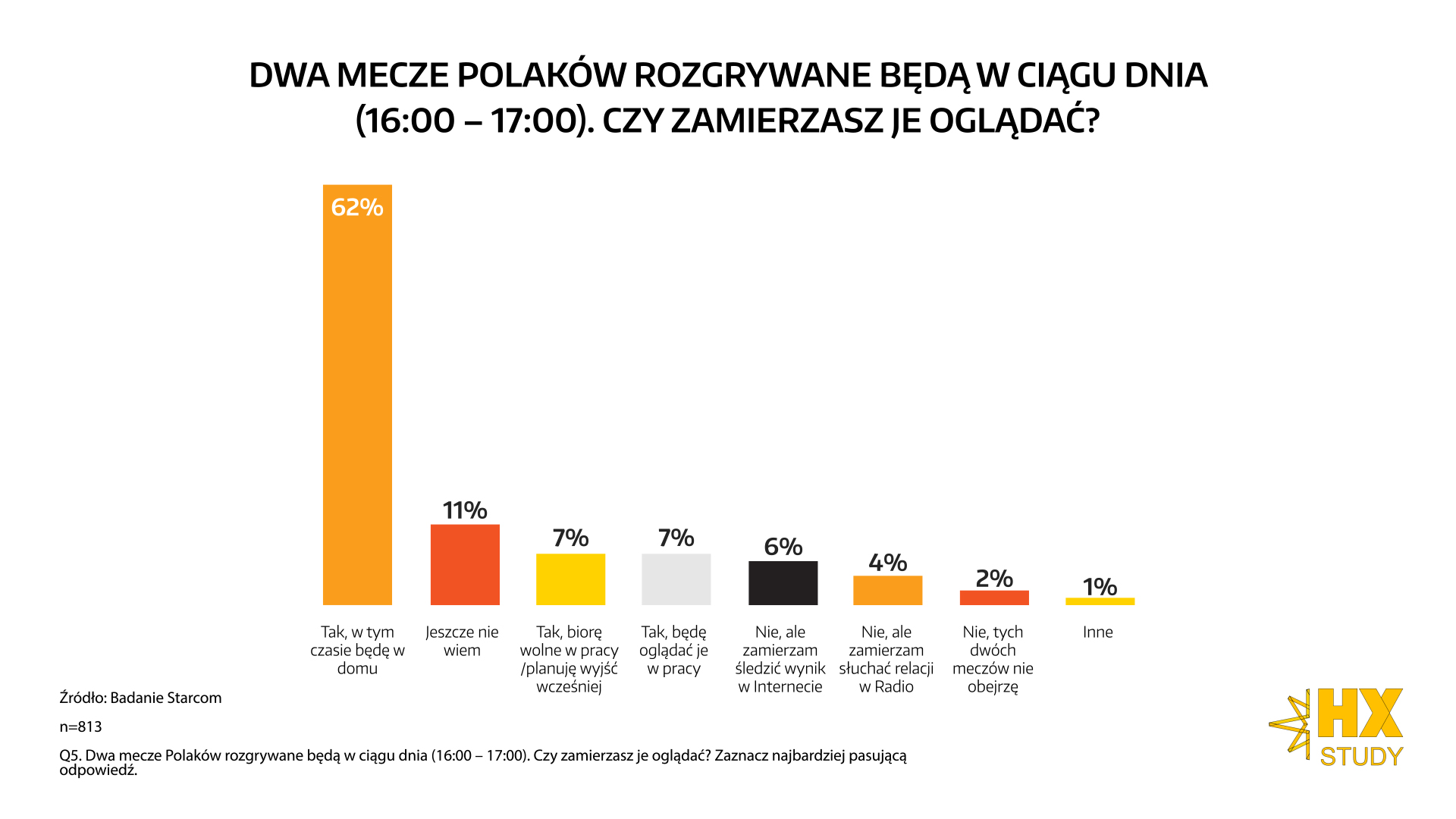 Część meczów reprezentacji Polski transmitowana będzie w godzinach pracy. Mimo to, respondenci w większości odpowiedzieli, że zamierzają oglądać je w domu. 7% zamierza wziąć z tej okazji wolne w pracy lub wyjść wcześniej, tyle samo ankietowanych zamierza oglądać je w pracy. Z pozostałych sposobów śledzenia wyniku na żywo, takich jak transmisja tekstowa w internecie oraz słuchanie relacji w radio, zamierza skorzystać 10% Polaków. Mecze rozgrywane w trakcie dnia nie wpływają więc na zmianę nawyków w sposobie śledzenia zmagań sportowych i nadal widoczna jest tu przewaga telewizji nad pozostałymi mediami.