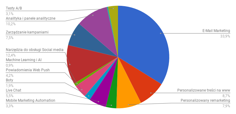 Najczęściej używanym narzędziem w pracy marketera jest e-mail marketing – aż 33% respondentów korzysta z tego typu działań. Do najrzadziej używanych narzędzi ankietowani zaliczyli nowe technologie: Boty (1%) i Machine Learning (0,9%). Najbardziej przereklamowanymi narzędziami zdaniem uczestników badania są płatne promocje online (16,54%) oraz blog firmowy (15,75%).