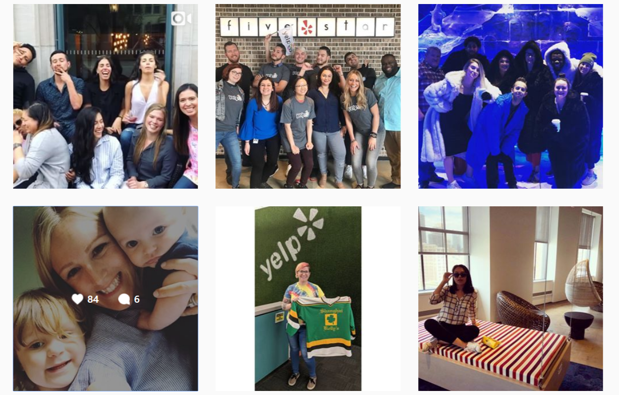 Bardzo dobrze rozumieją to osoby zarządzające serwisem internetowym Yelp, który agreguje opinie o restauracjach, barach i lokalach rozrywkowych (największą popularnością cieszy się w Stanach Zjednoczonych). Za pomocą #fivestarscareer pracownicy Yelp mogą oznaczać na Instagramie swoje zdjęcia z życia zawodowego – i tym samym wystawiać opinię o swoim pracodawcy. Czy nie przekonuje Was wall pełen uśmiechniętych i zadowolonych pracowników?
