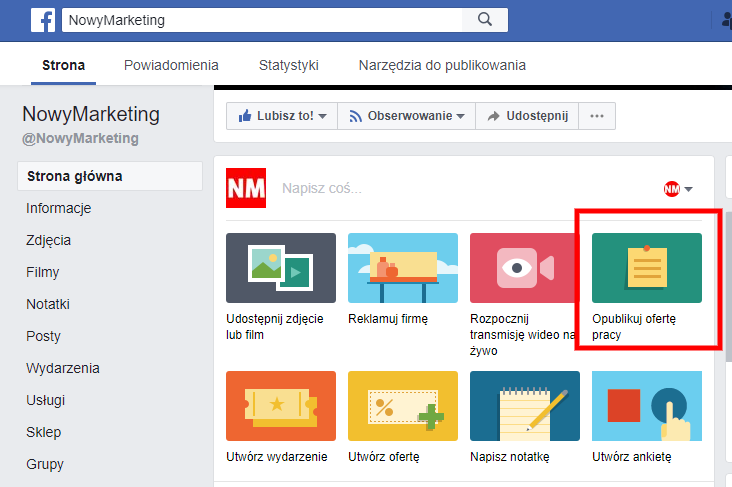Post publikujesz z poziomu widoku strony na Facebooku. Przechodzisz do pola, gdzie dodaje się posty – tam należy rozwinąć listę dostępnych opcji i wybrać „Opublikuj post z ofertą pracy”.