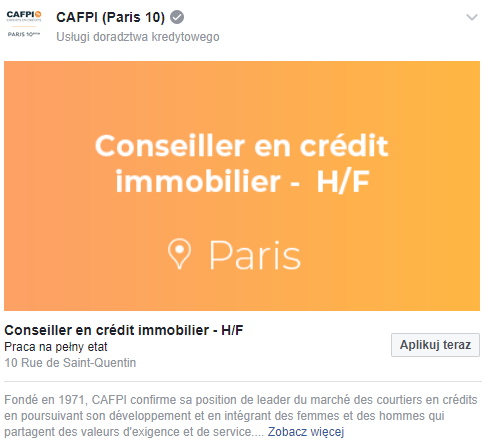 - Ogłoszenie jest zaciągane na listę ofert pracy, którą Facebook agreguje dla każdego użytkownika w zakładce facebook.com/jobs/. Masz więc większe szanse na dotarcie do odpowiednich ludzi, bo miejsce na tej liście zapewnia ci zasięg organiczny. Będzie on rósł wraz ze zwiększającą się liczbą ogłoszeń oraz wzrostem świadomości użytkowników, że Facebook może służyć też do rekrutacji.