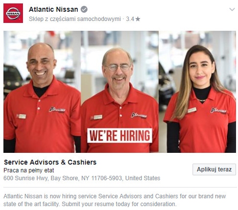 - Dobierz odpowiednie zdjęcie, które będzie pasowało do treści twojego ogłoszenia, ale będzie się również wyróżniało na tablicy użytkownika. Rywalizujesz nie tylko z innymi ofertami pracy, ale także z każdą inną treścią, którą widzi użytkownik. Wykorzystuj zdjęcia ludzi – oni skutecznie przyciągają uwagę. Nie bój się kolorów i kontrastów. Oczywiście wszystko powinno być spójne ze stylem komunikacji twojej firmy. Pamiętaj także o odpowiedniej wielkości zdjęć, obrazki poniżej 500 pikseli będą wyglądały źle, ponieważ Facebook zrobi z nich „pikselozę”.