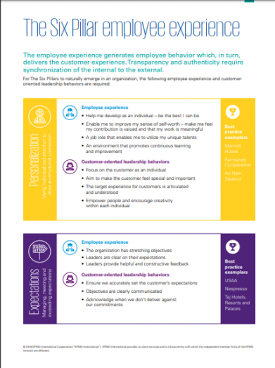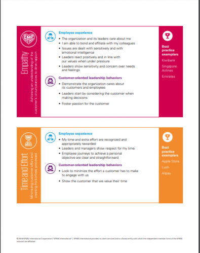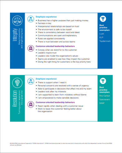 Firmy będące liderami we wdrażaniu doświadczeń klientów potrafią nie tylko dogłębnie zrozumieć potrzeby konsumentów i odpowiedzieć na światowe wyzwania, ale także z podobną skrupulatnością spojrzeć na własne możliwości, standardy czy regulacje. Marki rozumieją, że pozytywne doświadczenia klienta muszą mieć swoje źródła w organizacji – dlatego w 2017 r. 55% dyrektorów generalnych, którzy wzięli udział w badaniu KPMG CEO Outlook, deklarowało dostosowanie procesów w firmie do bardziej proklienckiego podejścia. Konsumenci doceniają firmy, które w celu ulepszenia doświadczeń klienckich zmieniają własne procedury. Przykładem jest jedna z najlepiej ocenionych w badaniu organizacji, która udostępnia budżet o wartości kilku tysięcy dolarów do rozdysponowania pracownikom mającym bezpośredni kontakt z klientem, aby mieli możliwość dostarczenia wyjątkowej obsługi klienta lub naprawienia popełnionego błędu. Inna firma osiągnęła wysokie oceny dzięki temu, że zachęciła pracowników do swobodnego wyrażania siebie i swojej kultury i – zgodnie z nimi – wchodzenia w naturalne, mniej oficjalne interakcje z klientami, którzy doceniają taki rodzaj autentyczności.