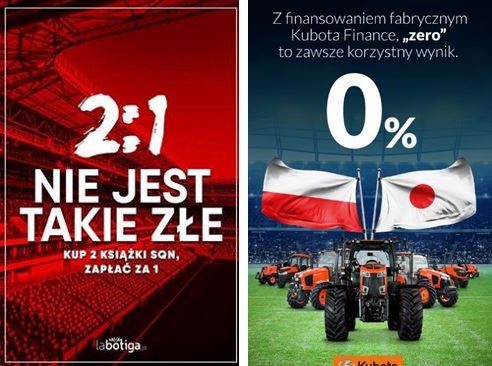 Podczas mundialu spotkać można było też marki szukające w najgorszych chwilach pozytywów, przekuwając porażki Polaków w specjalnie przygotowane promocje na swoje produkty/usługi. Z mundialową zniżką zakupić można było nową literacką pozycję, a nawet traktor.