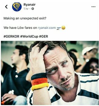 PS Porażki innych drużyn, szczególnie faworytów, również były w internecie często komentowane. Tanie linie lotnicze Ryanair zareagowała na porażkę drużyny Niemiec, gwarantując jej lot do domu nawet w najmniej oczekiwanym momencie.