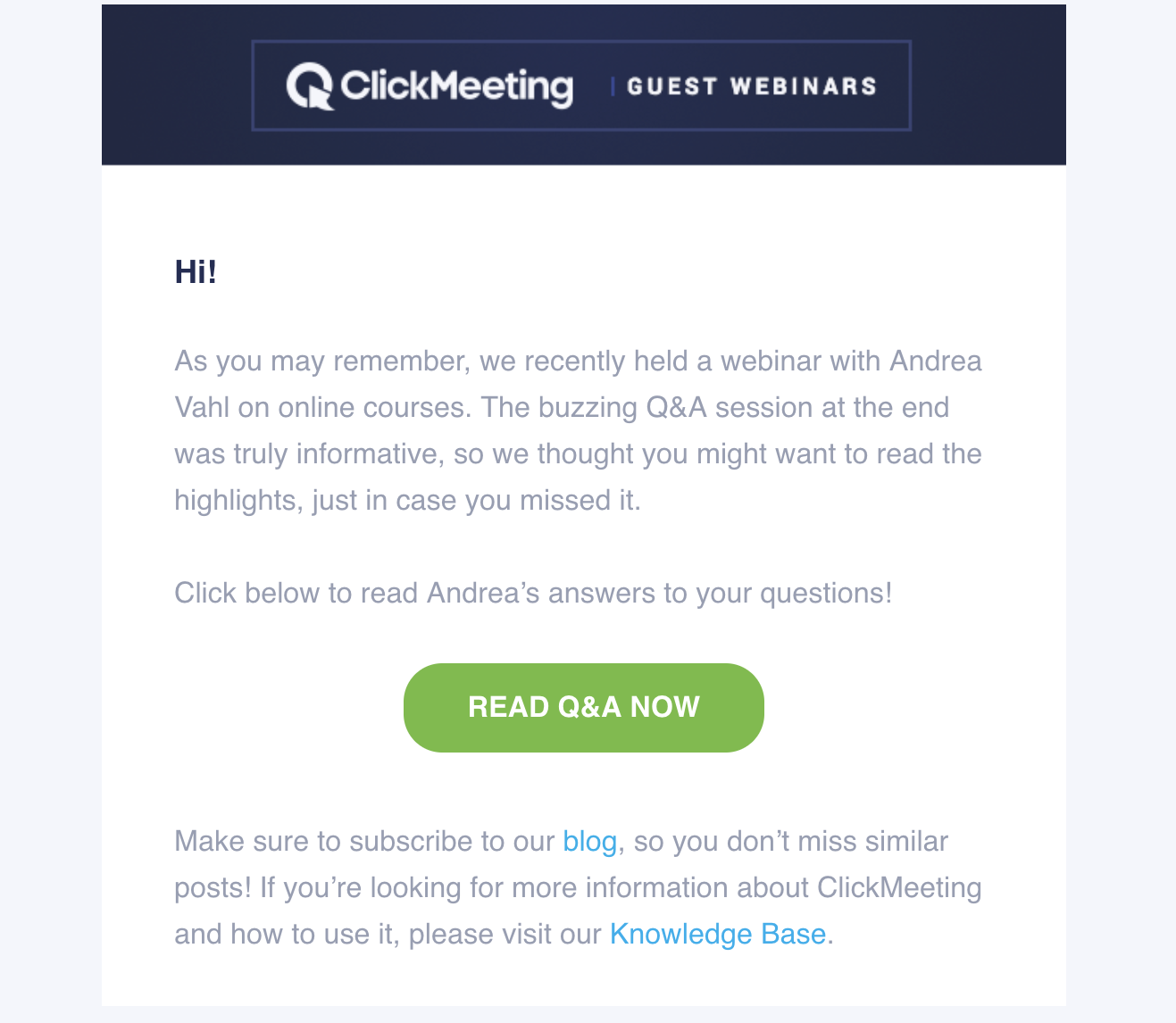 Zapewne już podczas twojego webinaru uczestnicy zadali mnóstwo pytań, nie wspominając o tym, co się działo podczas sesji Q&A. Istnieje więc spore prawdopodobieństwo, że nie udało się odpowiedzieć na wszystkie z nich. Pamiętaj, aby nie pozostawiać ważnych pytań bez odpowiedzi.