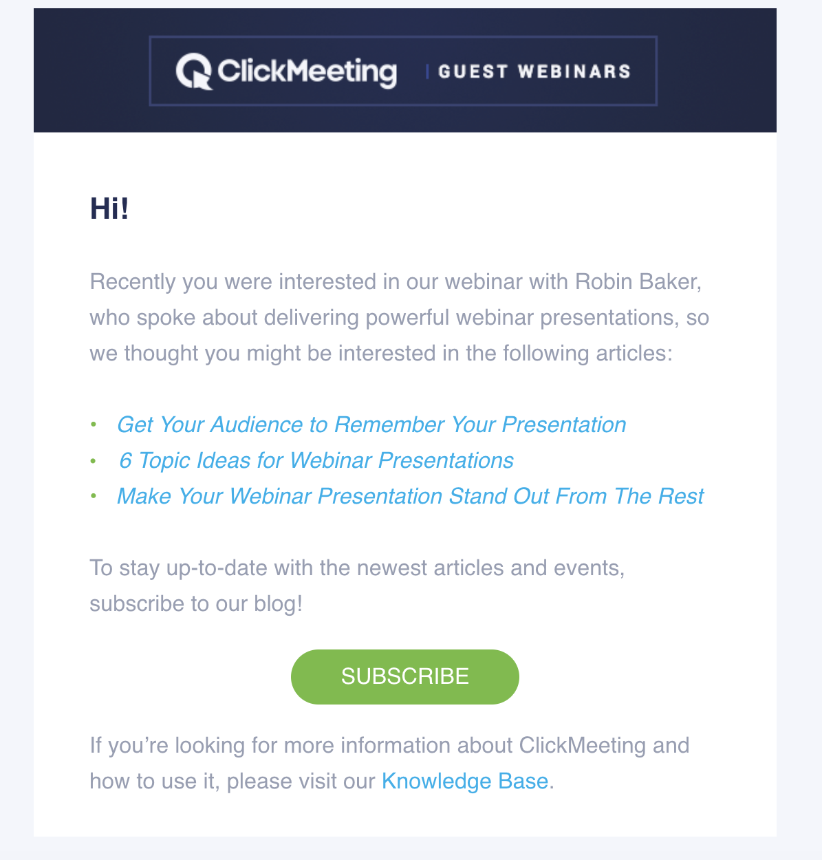 W mailu warto uwzględnić również podsumowanie webinaru oraz prezentację wykorzystaną w jego trakcie. Dodatkowo podziel się linkami do wartościowych treści. Możesz też pójść o krok dalej i udostępnić uczestnikom darmowy ebook, raport lub poradnik, które pozwolą im lepiej zgłębić temat.