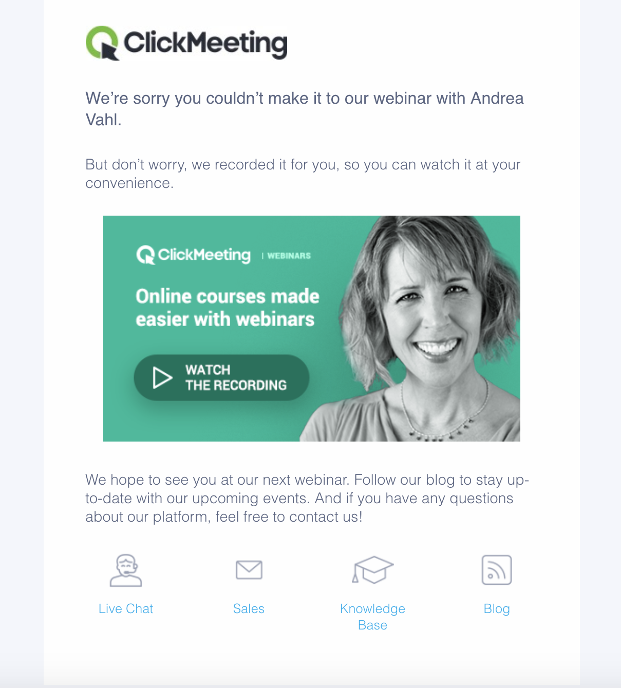 Z pewnością część zarejestrowanych osób nie obejrzała twojego webinaru na żywo, a niektóre osoby, które go widziały, mogły przeoczyć pewne istotne fakty. Wyciągnij do nich pomocną dłoń! Po podziękowaniu za udział i zebraniu feedbacku udostępnij im nagranie wydarzenia. Dzięki temu będą mogli jeszcze raz obejrzeć twoją prezentację.