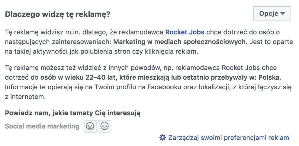 Klikając opcję „Dlaczego to widzę” w prawym górnym roku reklam, możesz poznać szczegóły targetowania, z których korzysta interesująca cię marka (ilustracja 1).