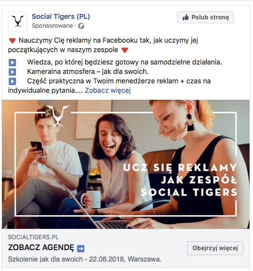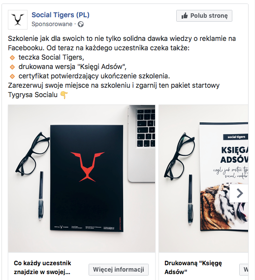 Jakie treści są promowane i jak wygląda lejek sprzedażowy danej firmy? W samej branży szkoleń marketingowych można zobaczyć różne podejścia do promocji i różne komunikaty sprzedażowe. Niektórzy tworzą lejek z bardziej zaawansowanych treści i retargetowania osób, które je odwiedzały. Inni stawiają mocno na wideo z wysoką częstotliwością. Jeszcze inni, na przykład my w Social Tigers stawiamy na promocję naszego cyklu contentowego #tigertip i osobom, które się pod nim angażowały od czasu do czasu sprzedajemy szkolenia. Wówczas wystarczy reklama z linkiem do strony WWW kursu czy post karuzelowy kierujący na stronę internetową (ilustracje 4 i 5).